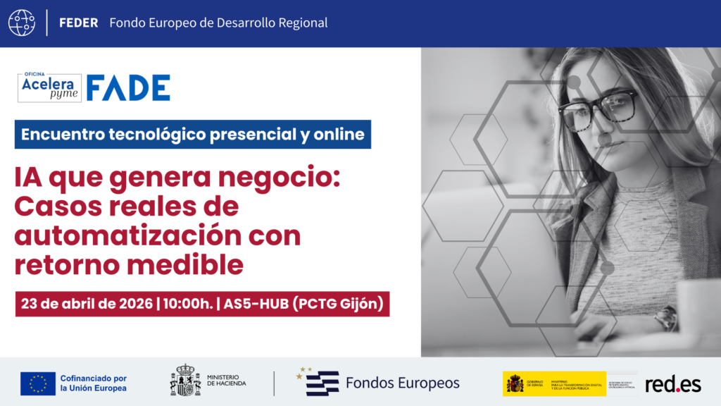 Desde la Oficina Acelera pyme de FADE – Empresas de Asturias te invitamos a esta jornada donde conocerás cómo la inteligencia artificial ya está transformando procesos clave en empresas, generando resultados medibles en ventas, operaciones y gestión.