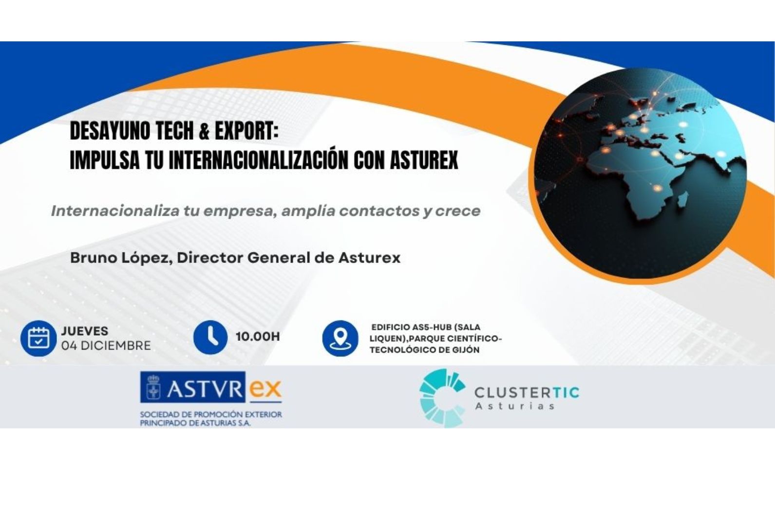 El jueves 4 de diciembre a las 10:00h, te esperamos en el Edificio AS5-HUB (Sala Liquen) del Parque Científico y Tecnológico de Gijón para una Jornada de Internacionalización con Asturex.