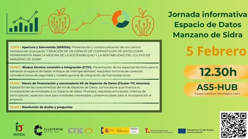 El Cluster TIC Asturias participará en la Jornada informativa “Espacio de Datos Manzano de Sidra”, que se celebrará el próximo 5 de febrero en AS5-HUB (Parque Científico Tecnológico de Gijón), un encuentro orientado a dar a conocer los avances del proyecto de creación de un espacio de compartición de datos como herramienta para mejorar la sostenibilidad y la rentabilidad del cultivo del manzano de sidra.
