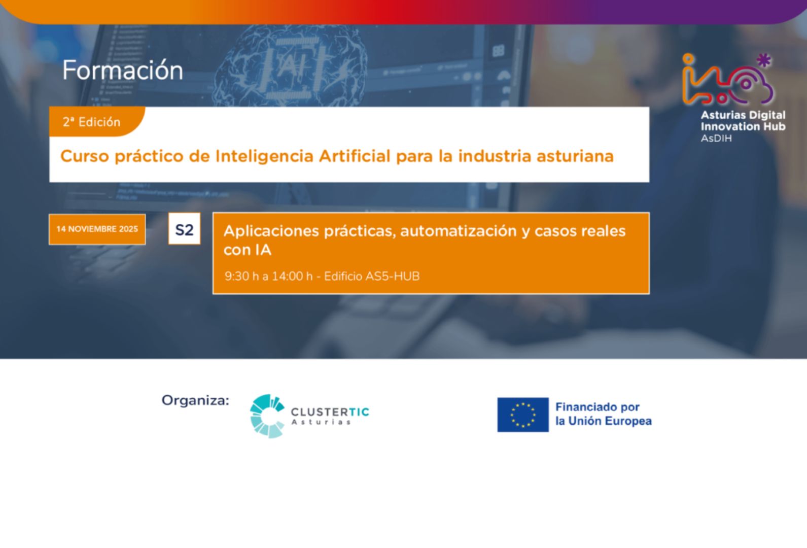 En el marco de las actividades promovidas por Asturias Digital Innovation Hub (AsDIH), desde el  Cluster TIC Asturias organizamos la segunda edición del Curso Práctico de Inteligencia Artificial para la industria asturiana, que se desarollará los días 7 y 14 de noviembre.